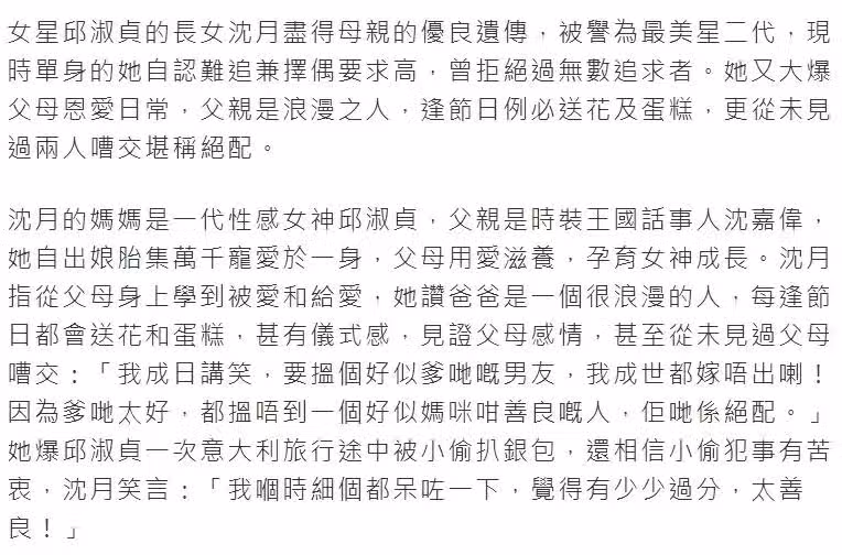 港媒一直說,邱淑貞是全港「第一旺夫」的女明星,她嫁給沈嘉偉的時候,男方只是普通商人,但二人婚後,沈嘉偉服裝生意越做越大,公司上市後更是以億元計算身家,邱淑貞不再需要拍戲,安心做外界眼中的「少奶奶」。