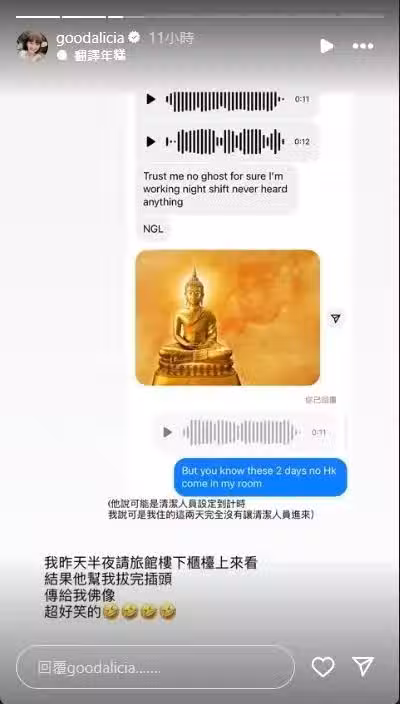 ▲工作人員傳佛像圖安撫愛莉莎莎。(圖/翻攝自愛莉莎莎IG)