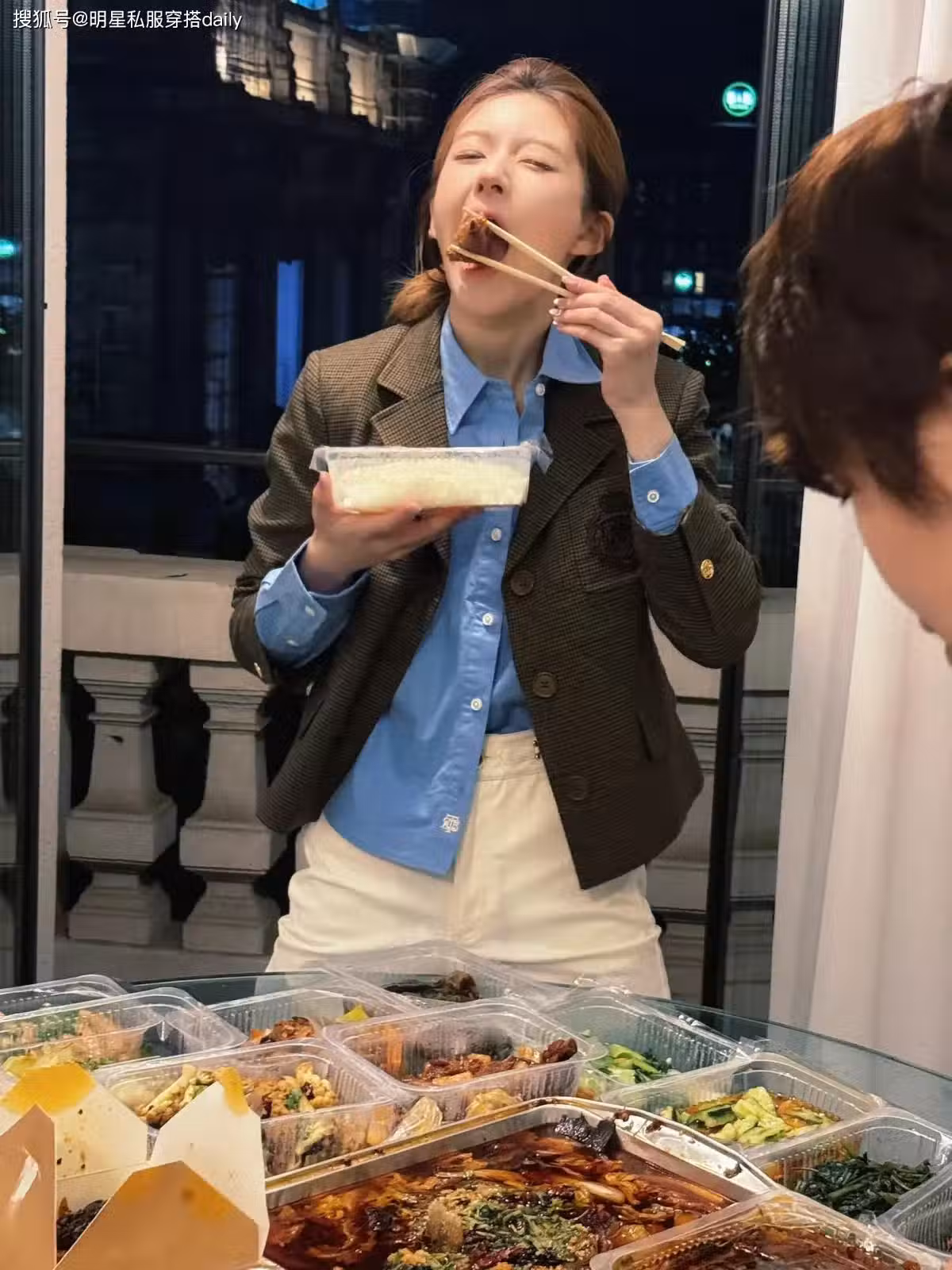 在異國他鄉也不忘記品嘗中國美食!鬼馬可愛的吃貨女孩兒!私下裡這套穿搭像極了日常通勤的時髦上班族!....................................