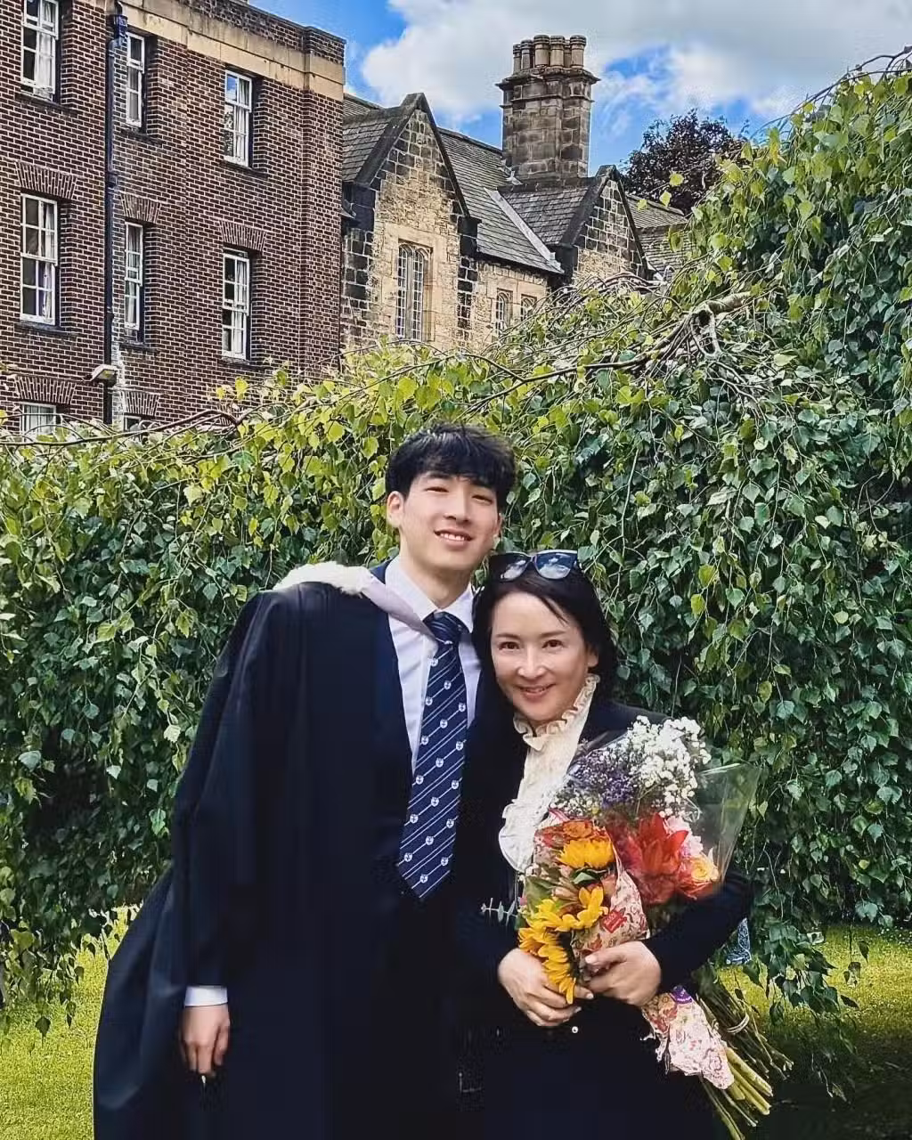 龔慈恩的小兒子林卓毅甚少曝光,早前曾返港探親,又陪媽媽出席飯局。龔慈恩前日(21日)發文透露兒子已經大學畢業,照片中見兩母子的合照,林卓毅穿上學士畢業袍,媽媽龔慈恩手執鮮花,輕靠在兒子的懷裡,另一張照片見兩母子合影時遇強風,但未有影響顏值。