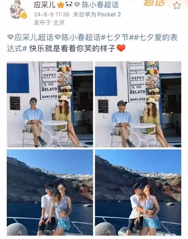 應采兒手拿咖啡,一臉燦爛笑容盯著陳小春看,那眼裡滿滿的都是愛意。