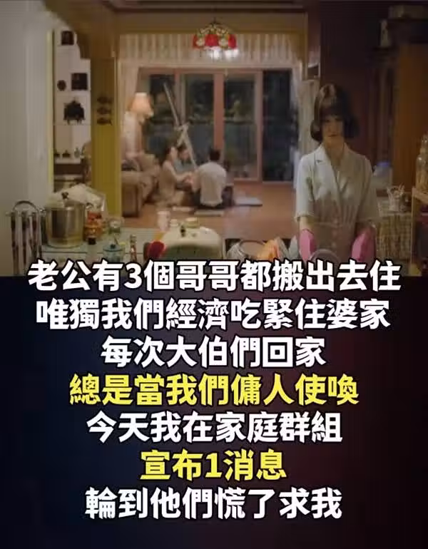 老公有3個哥哥都搬出去住,唯獨我們經濟吃緊住婆家,每次大伯們回家「總是當我們傭人使喚」,今天我在家庭群組宣布1消息,輪到他們慌了求我…