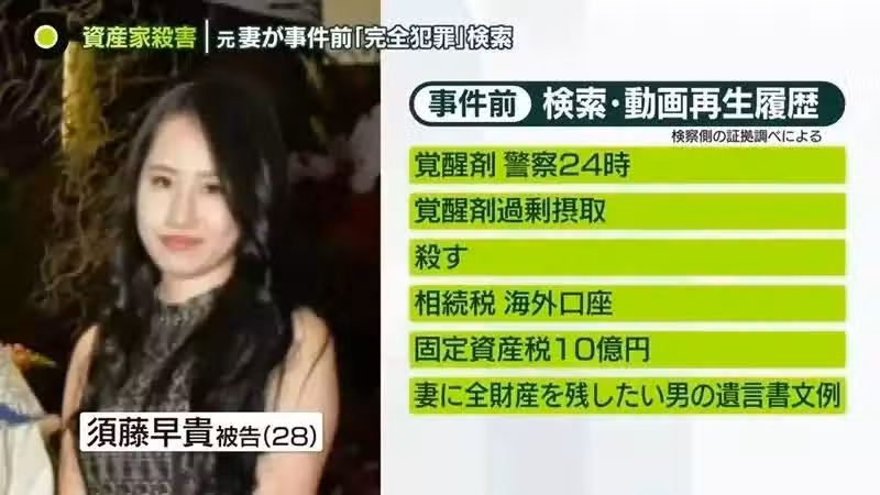 被指控殺人罪的須藤在法庭上否認自己下藥毒殺野崎。而檢察官則指出須藤在與野崎結婚前、以及野崎死亡前後,透過網上搜尋過「下藥死亡」、「老人 完全犯罪」、「野崎幸助 下藥」、「野崎幸助 」等關鍵字。