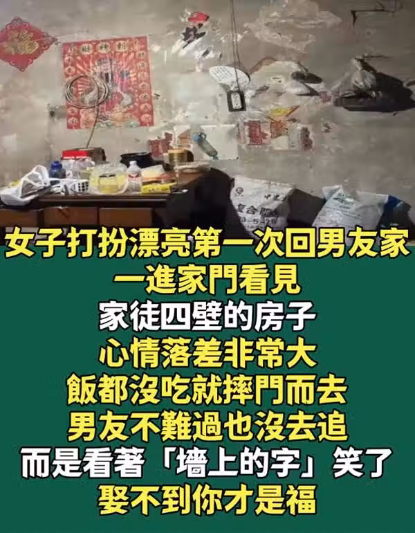 女子打扮漂亮第一次回男友家,一進家門看見「家徒四壁的房子」心情落差非常大,飯都沒吃就摔門而去。男友不難過也沒去追,而是看著「牆上的字」笑了:娶不到你才是福