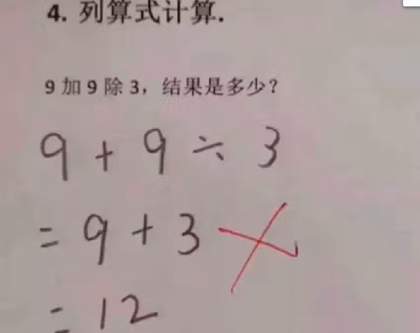 我兒子哪錯了?國小三年級數學題:「9+9÷3=12」被老師打叉!家長質問老師「反被打臉」:好好審題~