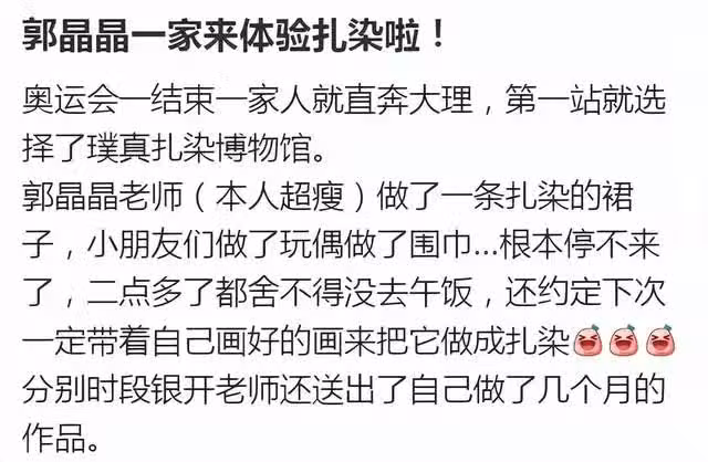 9月29日,有網友分享出前段時間奧運會結束後郭晶晶帶著家人來自家扎染博物館體驗扎染動態。見到郭晶晶本人的網友滿是激動,大讚郭晶晶真人很瘦。