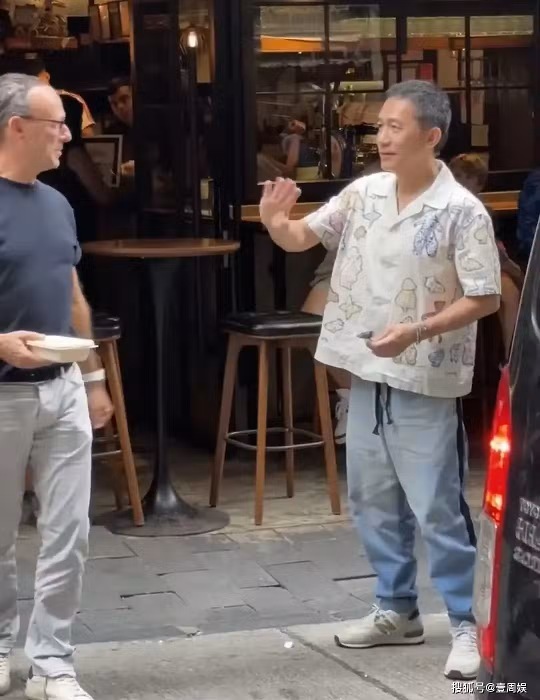 當天的梁朝偉身著花色的襯衫外套,搭配著牛仔褲跟運動鞋,正在街頭跟友人一起聊天,沒想到他的頭髮已經全部白了,隱約還有點黑色,但並不是那麼的明顯,看起來比熒幕上要蒼老許多。