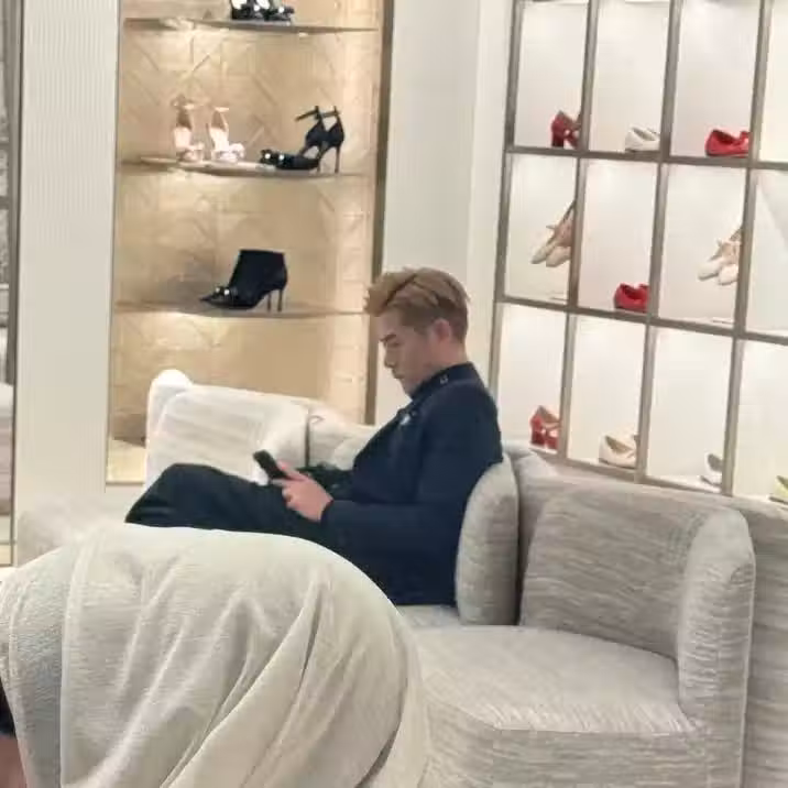 等到方媛開始在店裡挑選購物的時候,輪到郭富城等了,他坐在店裡的沙發上低頭默默刷手機,看起來還是很有耐心的。看來就算是天王,老婆購物的時候也得坐下刷手機慢慢等呀。
