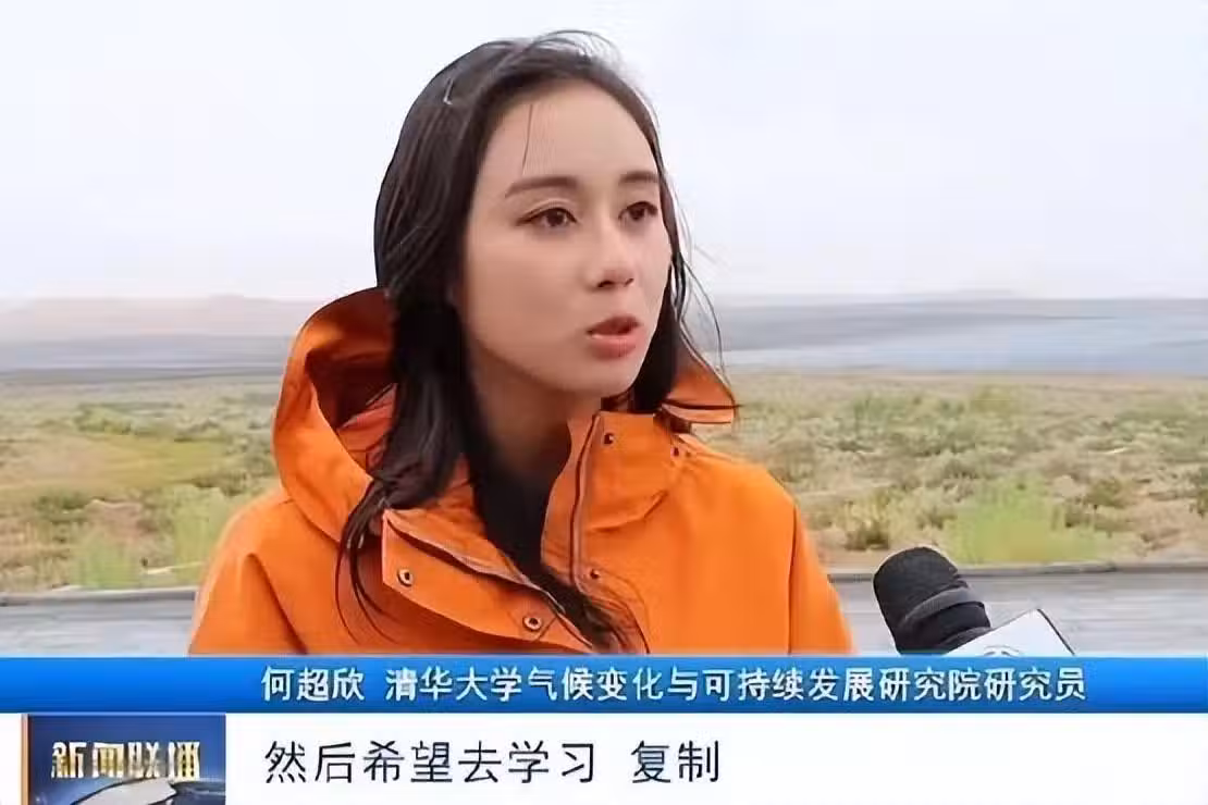前不久,何超欣就以研究員的身份現身於鄂爾多斯的太陽能計劃電站。在現場的何超欣同樣接受了官媒的採訪,並且談到了關於光電計劃與環境氣候的影響。