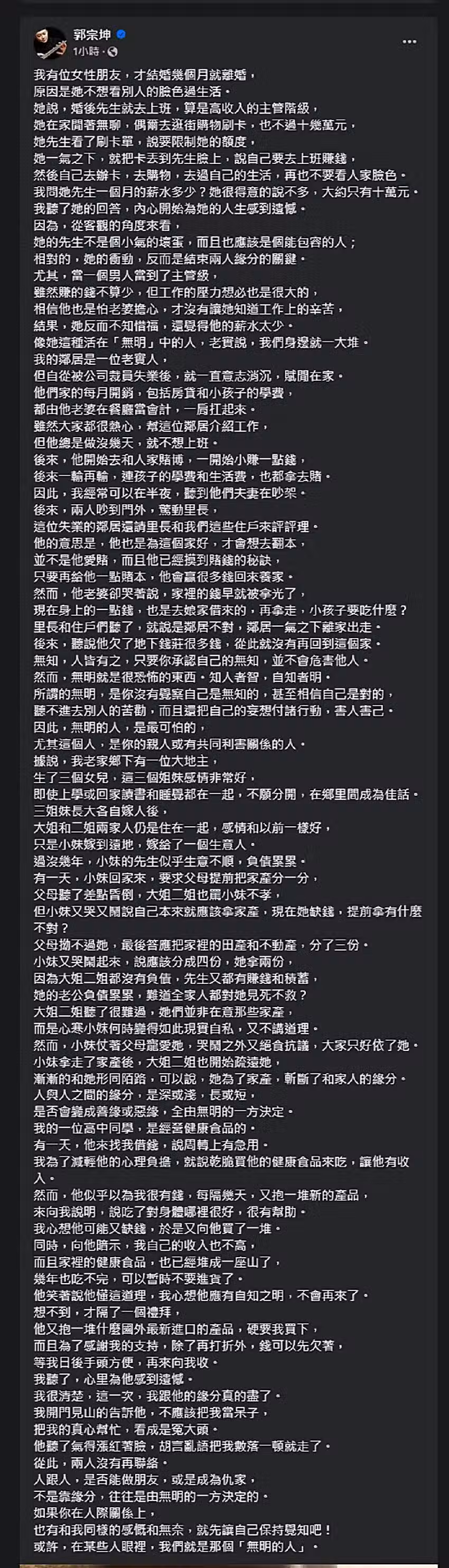 見此,網友說:「寫的真好,謝謝開示」、「離婚的人很多,理由千百種,往前看不就得了」、「文長有理」。