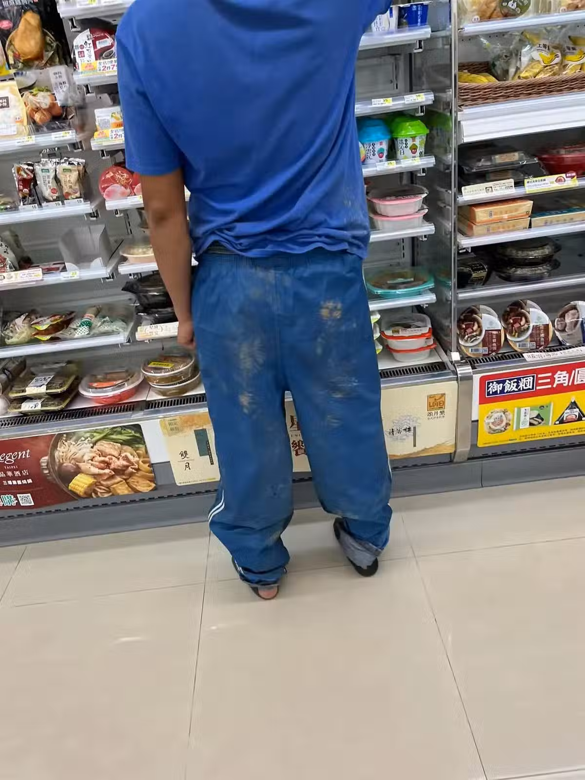 從照片中可以清楚看到,男子的衣物雖然不整潔,但顯然是因為工作原因才弄髒的。原PO心裡對這位打扮怪異的男子感到疑惑,特別是男子居然沒穿鞋就進了商店,實在讓人忍不住好奇。