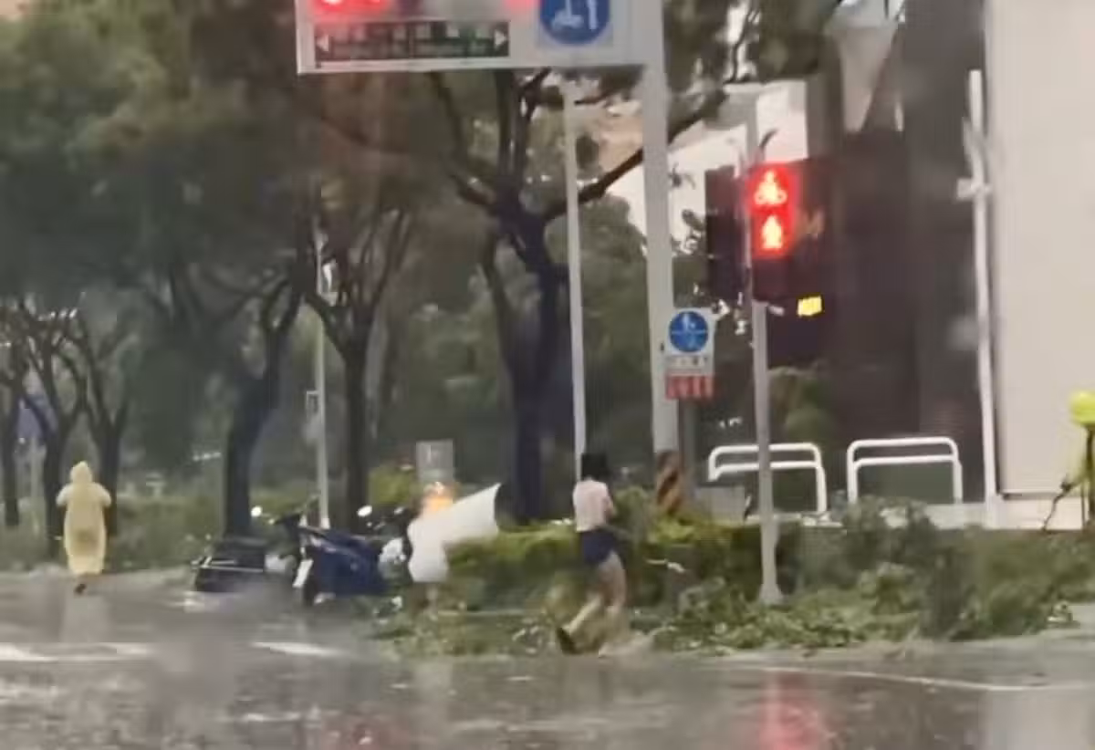 熱褲妹沒穿雨衣在路邊幫忙清理樹枝。(圖/翻攝自threads)