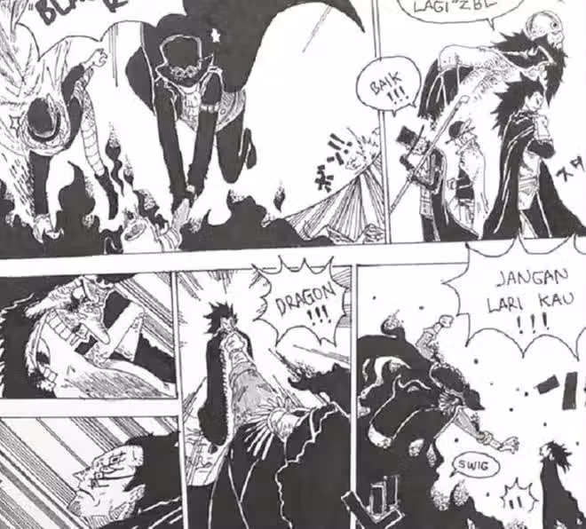 黑鬍子一人快速襲來,只見龍和另一位幹部沒有搭理黑鬍子,派出薩博和另一人去阻止黑鬍子。但是黑鬍子使用暗暗果實改變了位置,直接出現在龍面前,準備使用震震果實攻擊龍,要的就是一個措手不及。
