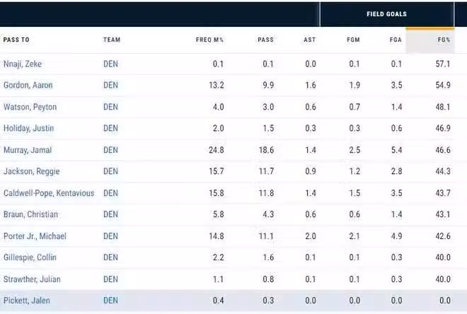 如圖所示,該季約基奇先後給12名隊友送出過傳球,其中11人完成投籃並且命中率均不低於40%。很大程度看,約基奇的傳球對隊友的投籃還有加成作用。