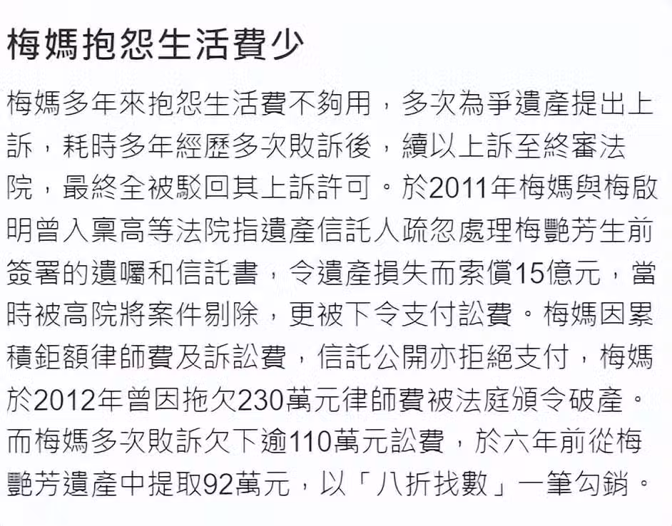 這種無理取鬧的起訴,法院自然不會搭理,屢次判梅媽敗訴,但梅媽不予理會,輸了也不支付律師費,2012年因拖欠230萬律師費被申請破產。