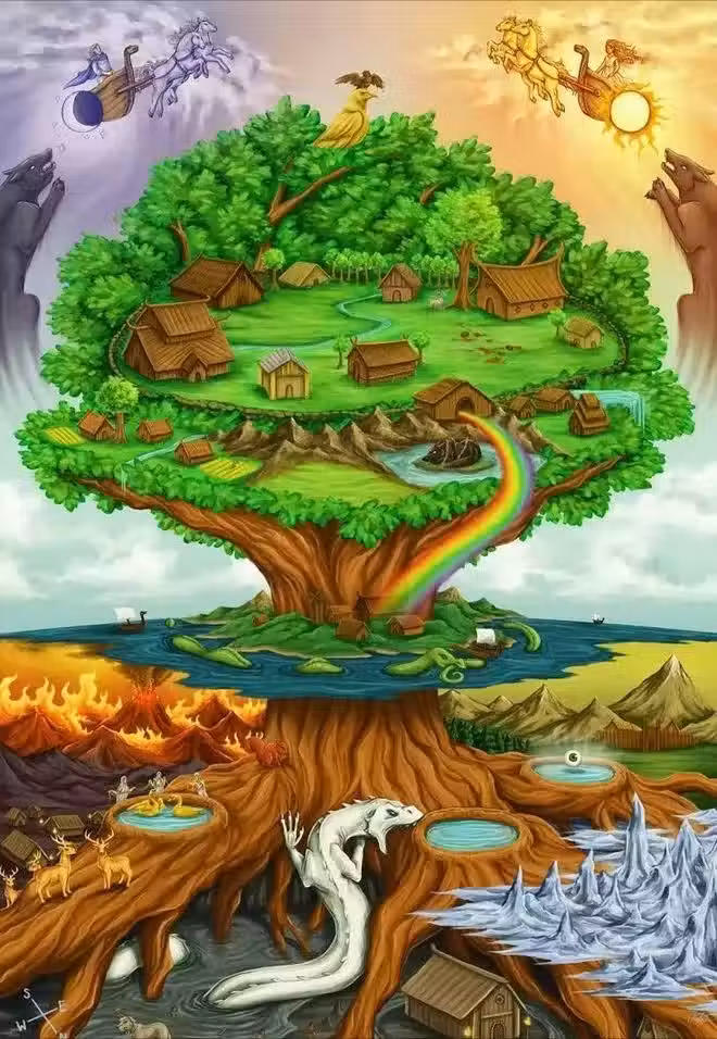 世界樹還有三根巨大的樹根,每一根樹根都帶有一個「聖泉」。在霧之國的樹根下有一條不斷啃食樹根的邪龍。它不停地咬著樹根,直到有一天當它終能咬斷這株樹,「諸神黃昏」就會來臨。
