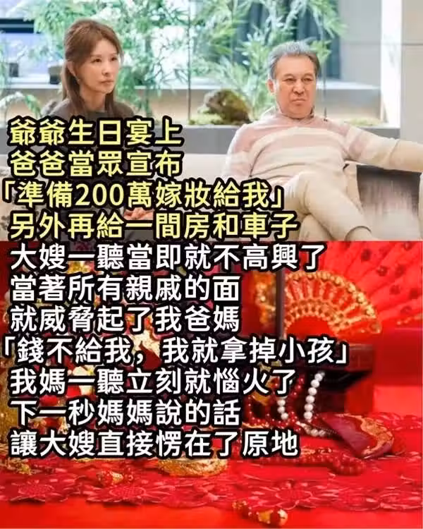爺爺的生日宴上,爸爸當眾宣布「準備200萬嫁妝給我」另外再給一間房和車子,大嫂一聽當即就不高興了,當著所有親戚的面就威脅起了我爸媽,「錢不給我,我就拿掉小孩」 我媽一聽立刻就惱火了,下一秒媽媽說的話讓大嫂直接愣在了原地....