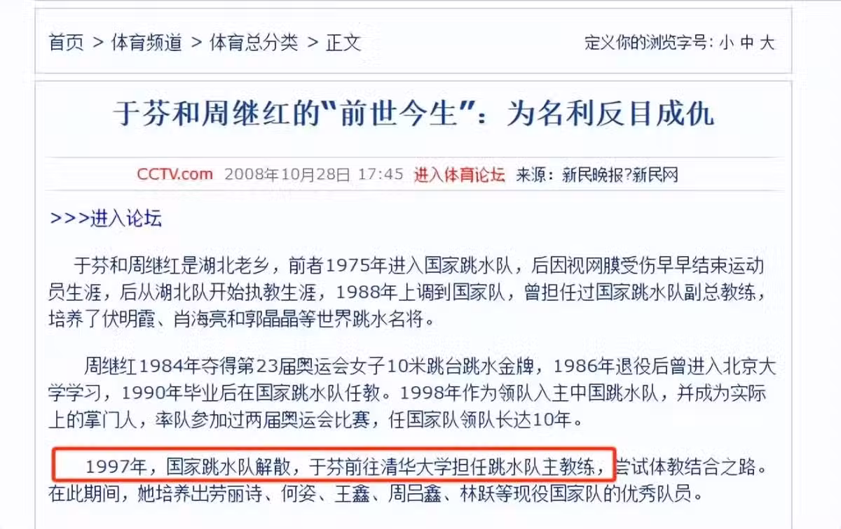 但這中間一年多的時間,於芬已經另起爐灶,在清華大學擔任跳水教練,並培養了一批優秀運動員,其中也包括世界冠軍伏明霞。