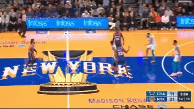 為布倫森完成掩護後羅賓遜快速順下,完成了一次非常精彩的空接。當然,這和布倫森的牽制防守人有很大關係。