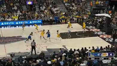 藉助追夢格林的掩護,庫里一路攆著拉塞爾完成突破終結。
