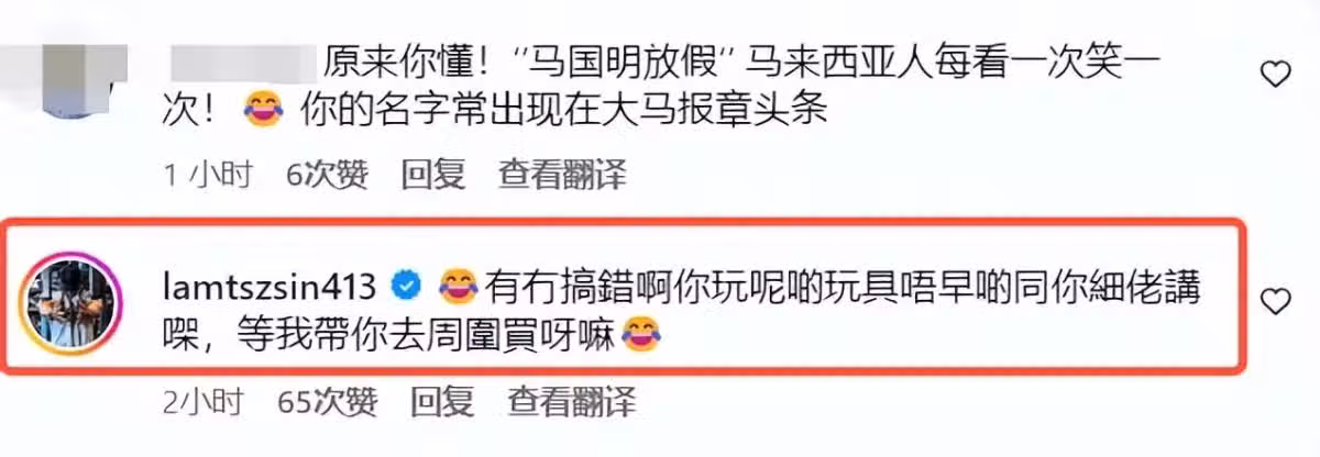 好友陳敏之笑指:「你這個倉挺大啊。」其好兄弟林子善則留言:「有沒有搞錯啊你玩這些玩具不早點和你弟弟說,等我帶你去四處買嘛。」林子善未有特別透露馬國明是否將榮升做爸爸,亦有人認為只是廣告宣傳手法之一。