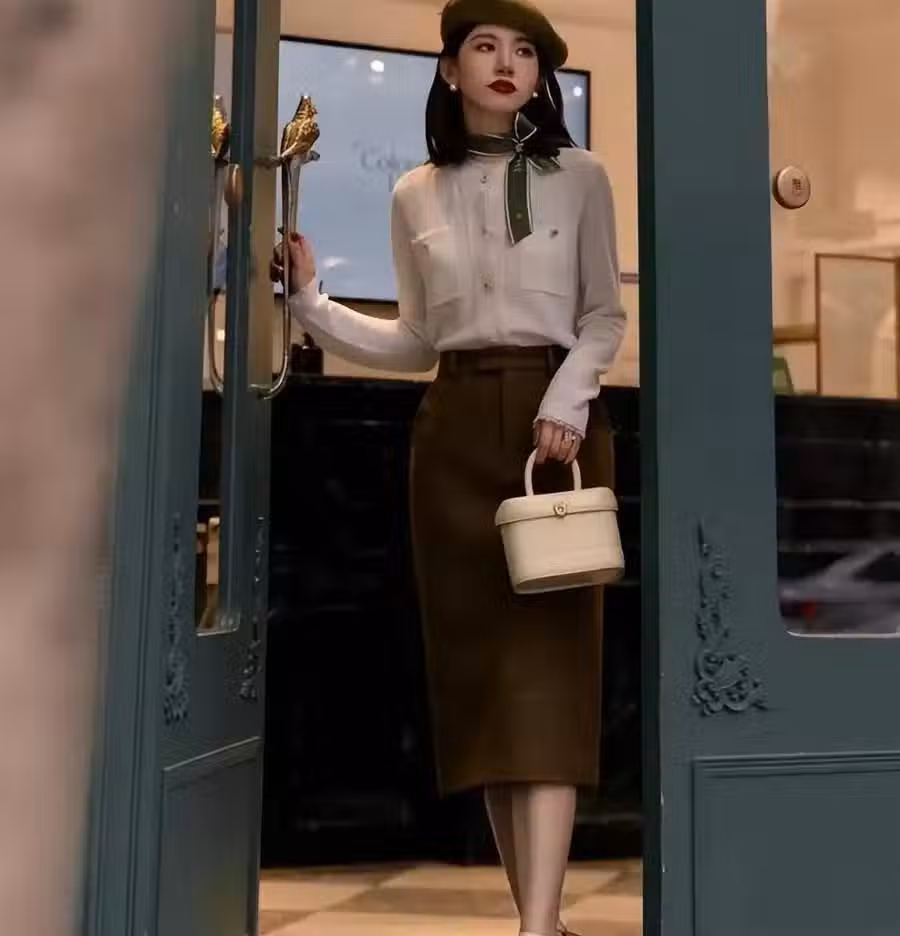 煙管裙的時尚優勢,來源於我們對乾淨曲線的追求,高腰直筒的設計可以塑造出腰臀部分乾淨的曲線,不至於像魚尾裙那樣包裹出累贅的肉感,縱向下垂的煙管裙面料具有一定的立體感,幫助我們縮減松垮的身材輪廓。