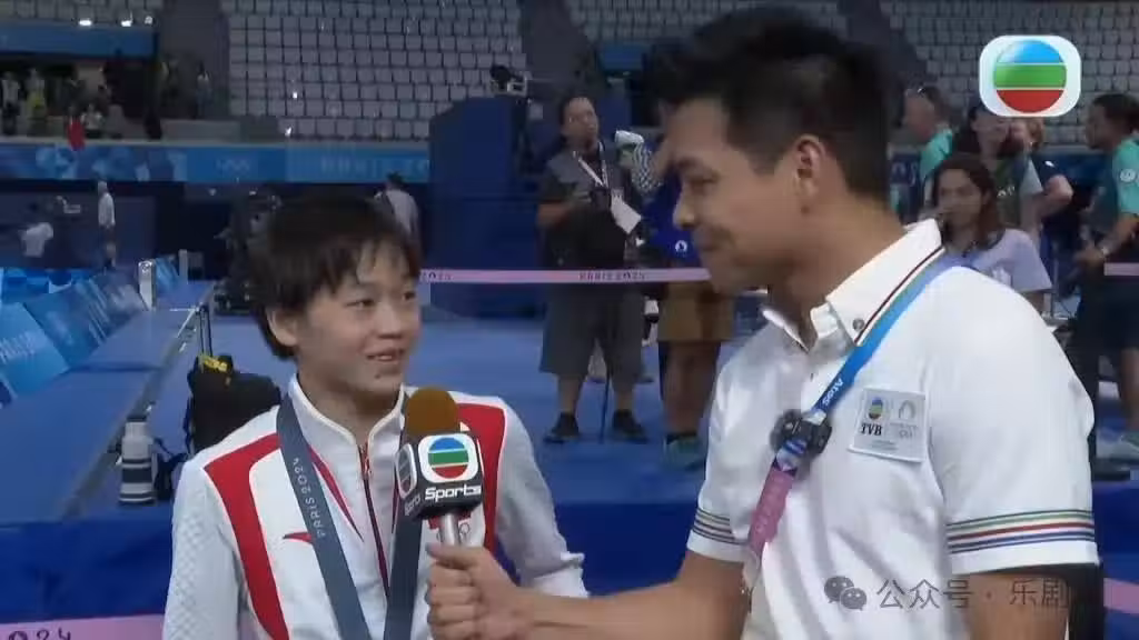 全紅嬋眼神望向鏡頭方向,估計有人叫她伸直受訪,她站直後就接不上回應,此時何沖輕拍全紅嬋的肩膀,以示鼓勵。