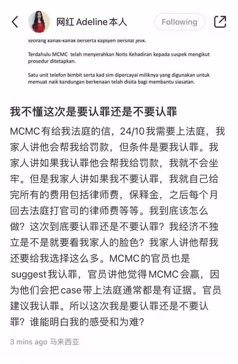 女奧客Adeline明被控 問網民: 我要認罪嗎?
