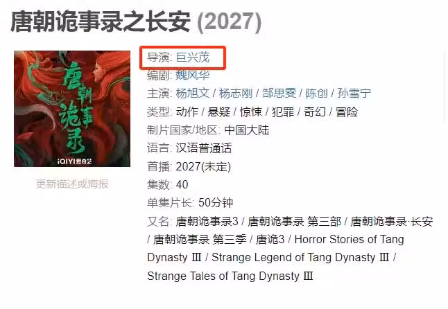現如今剛剛開拍的《唐詭之長安》,原來的導演柏杉成為了監製,現在的導演則換成了巨興茂,觀眾們自然會有所擔心。