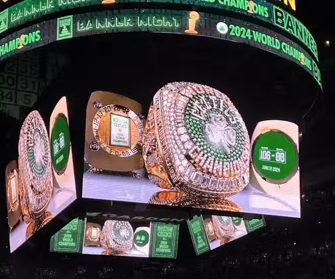 只是如此強悍的陣容,面對凱爾特人也是沒任何辦法。今天賽前凱爾特人升起冠軍旗幟 ,然後又頒發總冠軍戒指。可以說如日中天,加上塔圖姆奧運會的鍍金。凱爾特人士氣旺盛,從首節開局他們就殺瘋了,特別是三分球是怎麼投怎麼進。塔圖姆領銜,布朗和霍福德配合,凱爾特人外線箭如雨下,首節就以43-24領先19分。