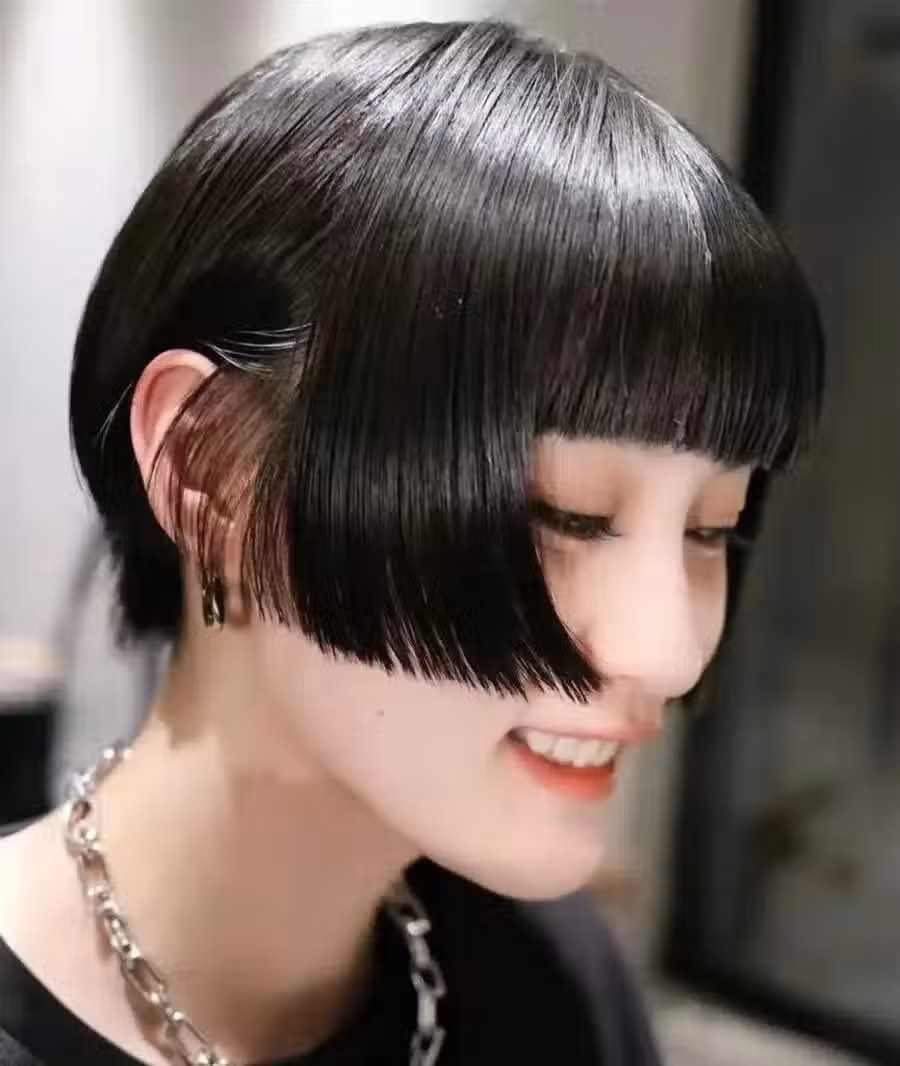齊齊的劉海,齊齊的側面造型,整個髮型看著特別的簡單,但是卻又時尚感十足,偶爾還可以把側面的頭髮掛到耳後一部分,這樣若隱若現的露出耳朵,配上耳飾又多了些精緻感。