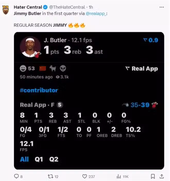 吉米-巴特勒已經不是這支熱火的一哥,整個夏天熱火官方的海報C位都是阿德巴約,這與巴特勒與萊利關係惡化有關,根據《邁阿密先驅報》的報道,就算熱火為巴特勒開出提前續約合同,巴特勒也不會接受。結果開場巴特勒就用8分鐘,4中0,三分1中0拿1分3籃板3助攻1搶斷回報熱火。