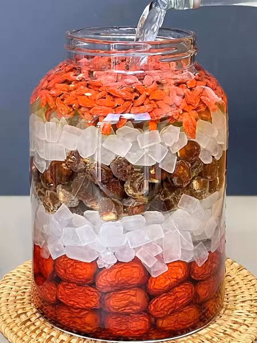食材:紅棗、桂圓、枸杞、糧食酒(糧食酒選泡果酒專用的,三蒸米酒即可,泡出來的酒味道更香醇)、糖