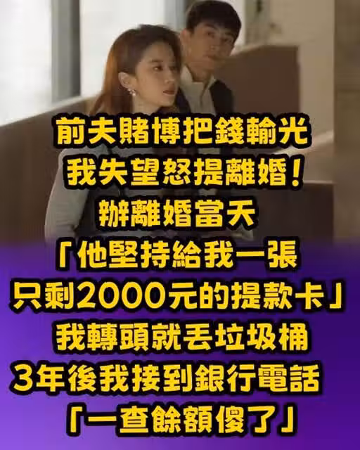 前夫賭博把錢輸光,我失望怒提離婚! 辦離婚當天「他堅持給我一張只剩2000元的提款卡」我轉頭就丟垃圾桶,3年後我接到銀行電話「一查餘額傻了」