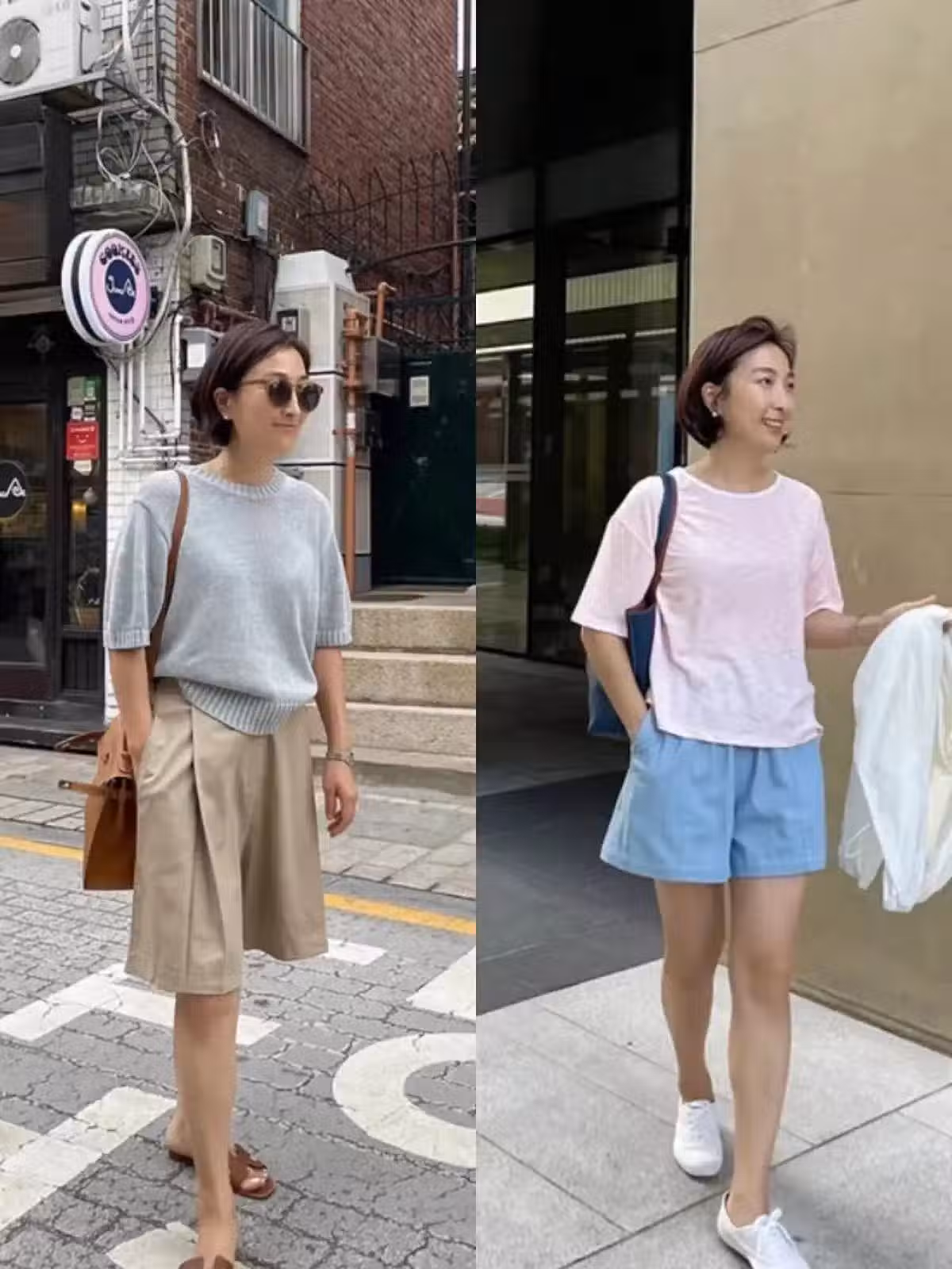 那麼有哪些搭配思路值得普通人參考呢?像短袖針織衫+高腰短褲,純色襯衫+純色長半裙,又或者短袖衫+純色九分褲等等。