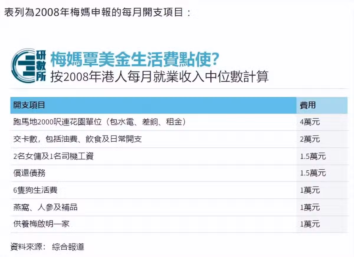 梅媽最初的生活費是每個月7萬,現在已經漲到25萬港幣,曾有港媒公開梅媽的消費清單,其中一項是給狗狗的開銷就多達1萬元,幾乎與梅啟明一家三口同等待遇。