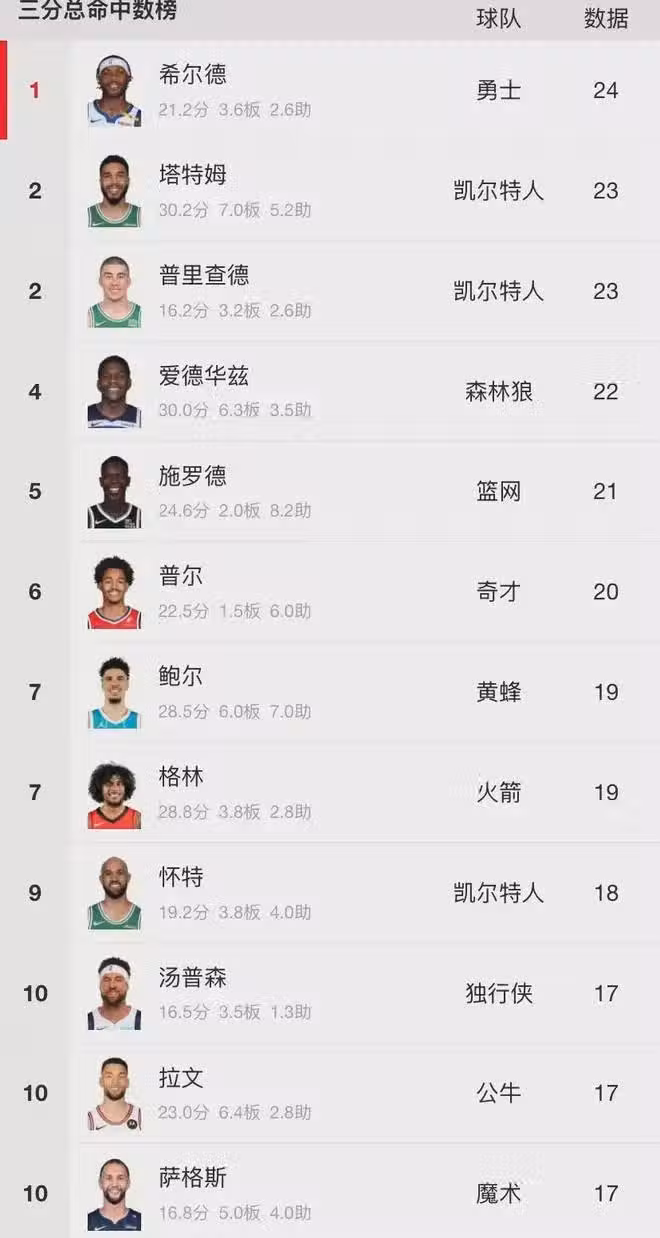 希爾德場均命中4.8記三分,排名聯盟第三,僅次於愛德華茲和普爾。開季5場,希爾德分別砍下22分、27分、8分、28分和21分。有人說,拿4場20+不難啊,有啥好說的?希爾德上賽季在76人,打了26場常規賽才拿到4場20+!