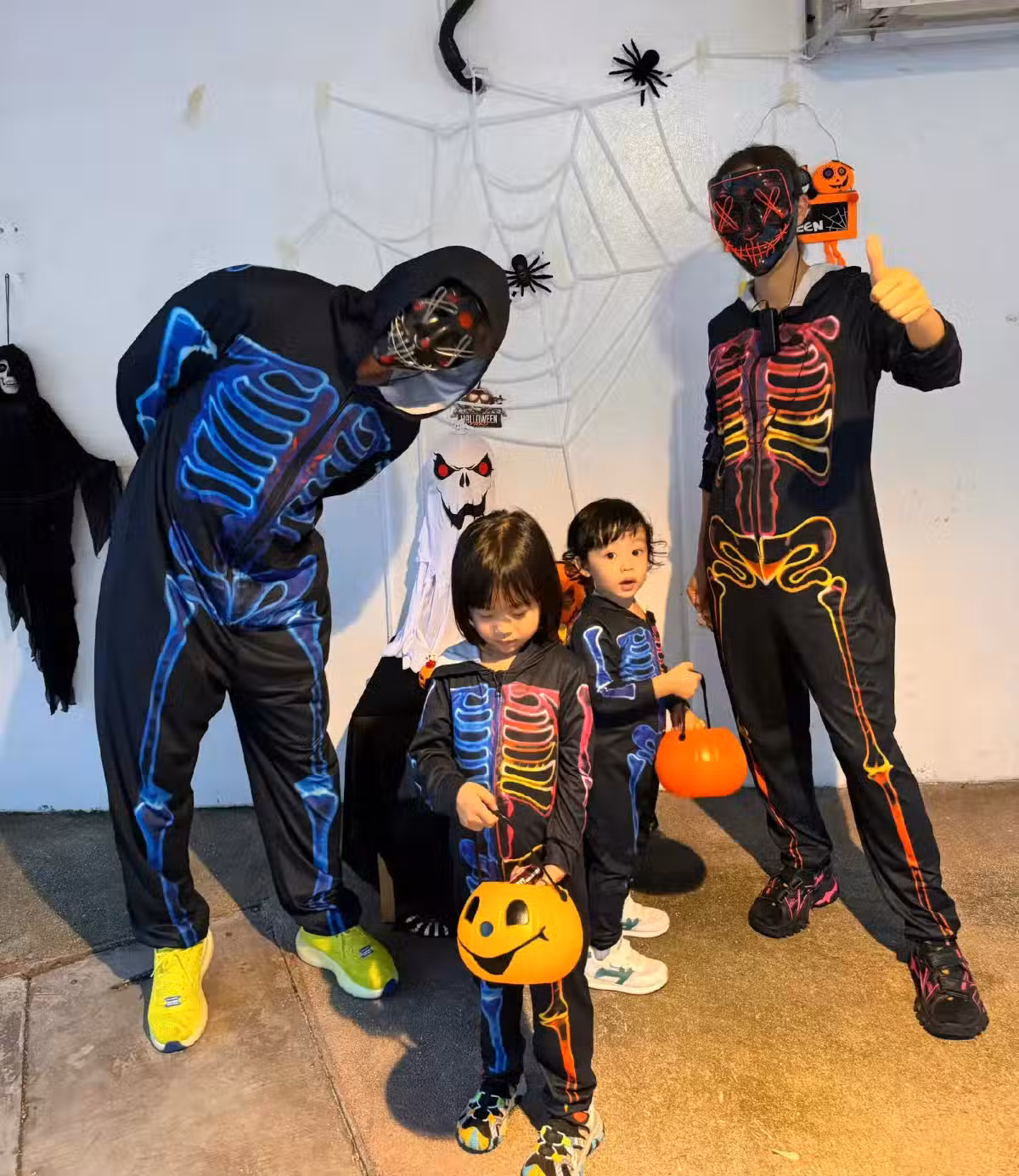 照片中,一家四口穿著萬聖節骷髏親子裝出鏡,楊怡身穿紅色圖案,羅仲謙身穿藍色衣服,夫婦倆還戴著面具,把自己裹得嚴嚴實實,完全不露臉,但看身形還是能認出來的。