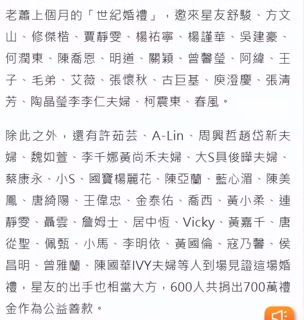 台媒公開了參加婚禮的名單,台灣省半個演藝圈藝人都來了。