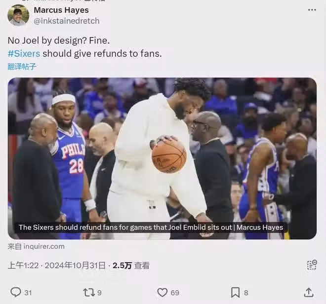 11月3日,恩比德和費城記者Marcus Hayes爆發衝突,教主在上一篇文章簡單提了提,現在衝突的詳細原因曝光。Marcus Hayes是《費城問詢報》專欄作家,他指責恩比德長期休戰,76人應該給購買季票的球迷進行退款。