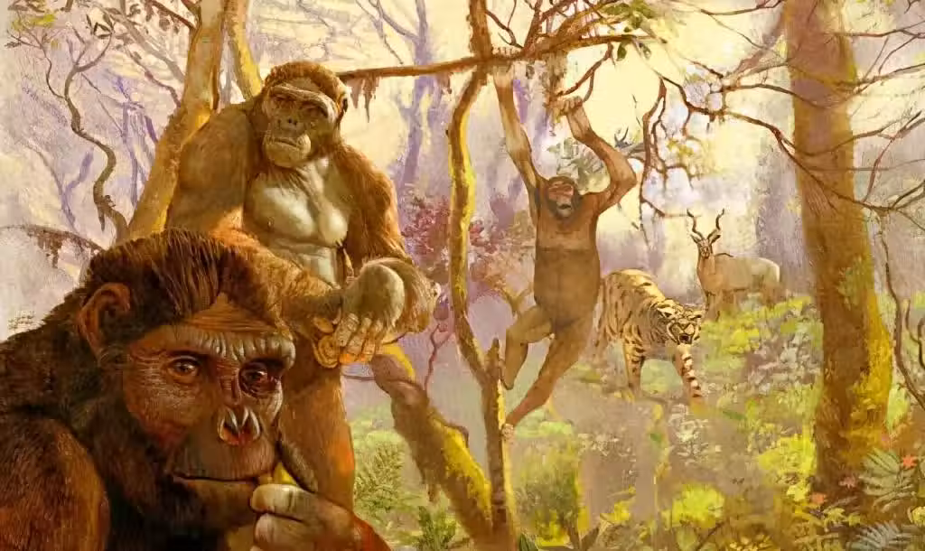後來由於隔離後的地區環境變化,部分猿類快速進化,從樹上到地面,從四肢爬行到直立行走,形成了最早的人類。