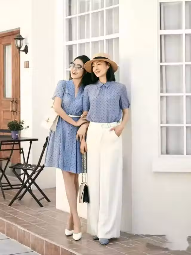 對於服飾風格的選擇,尖頭粗跟鞋更適合搭配一身比較正式、通勤的造型,比如這身look,藍色的波點襯衣搭配一條白色的西裝闊腿褲,色彩上非常清爽乾淨,再搭配一雙藍色的尖頭粗跟鞋,與上衣形成上下呼應,時尚感拉滿。