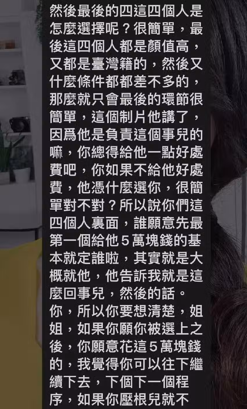 製片想從報名粉絲身上撈到好處,開出5萬元人民幣內定費。(圖/胡文英臉書)