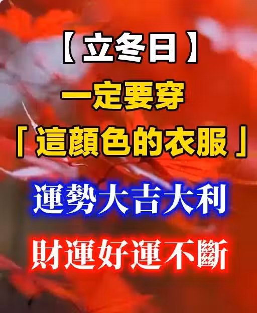 冬季天氣寒冷,五行喜火調候,火的顏色為紅色、粉紅色、紫色、紫紅、橘紅色等暖色系,穿著顏色鮮艷、亮麗、活潑且鬆軟衣物,能讓自己心情也亮起來,開心起來,神采飛揚,好運氣就跟著來,財運也不斷。