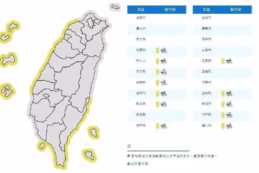 氣象署表示,受東北風增強影響,桃園至雲林沿海空曠地區及恆春半島、綠島、蘭嶼、澎湖、金門、馬祖易有9至10級強陣風,基隆北海岸、嘉義、台南及東半部沿海空曠地區亦有較強陣風,鄰近海域有較大風浪,籲請特別注意。