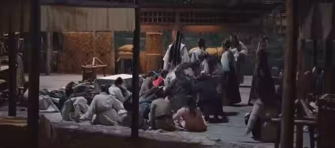 只有一位群演,這個人是站在中間的,其他人都已經倒下,他先給自己「放倒」,隨後找了個舒服的姿勢再直接躺下。