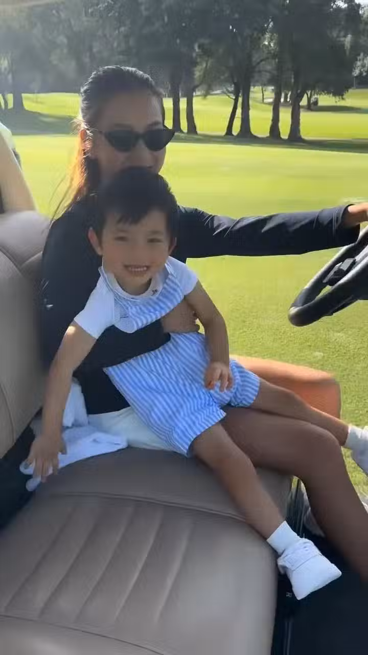 而何雁詩兩母子坐在高爾夫球車時,她一手摟著兒子,一手單獨駕駛球車,一心二用,非常厲害。【圖片源於網絡,侵權必刪】
