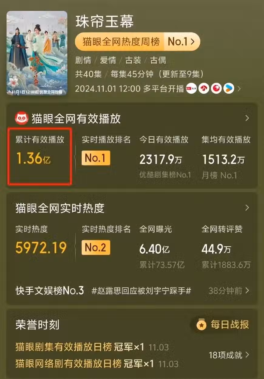 《珠簾玉幕》開播,才3天播放量破1.3億,更短短7集便吊足觀眾胃口