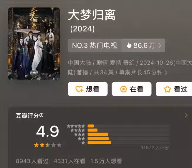 3部劇開分,《大夢歸離》4.9,《永夜星河》,7.5,對比傷害太大了