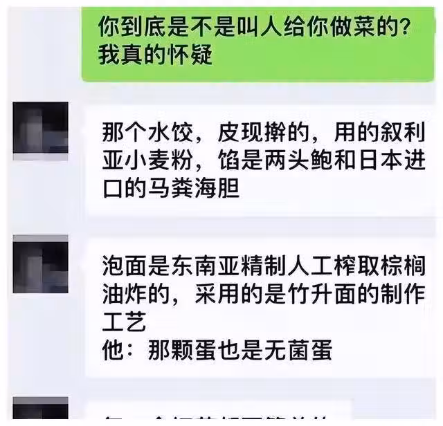 於是,網友就問男友,男友解釋:食材不一般,都是外國空運來的,面是敘利亞的,餡是高級海鮮鮑魚加海膽,就連蛋都是無菌蛋,健康營養,廚娘也不一般,都是高學歷,人工費也貴。